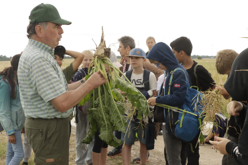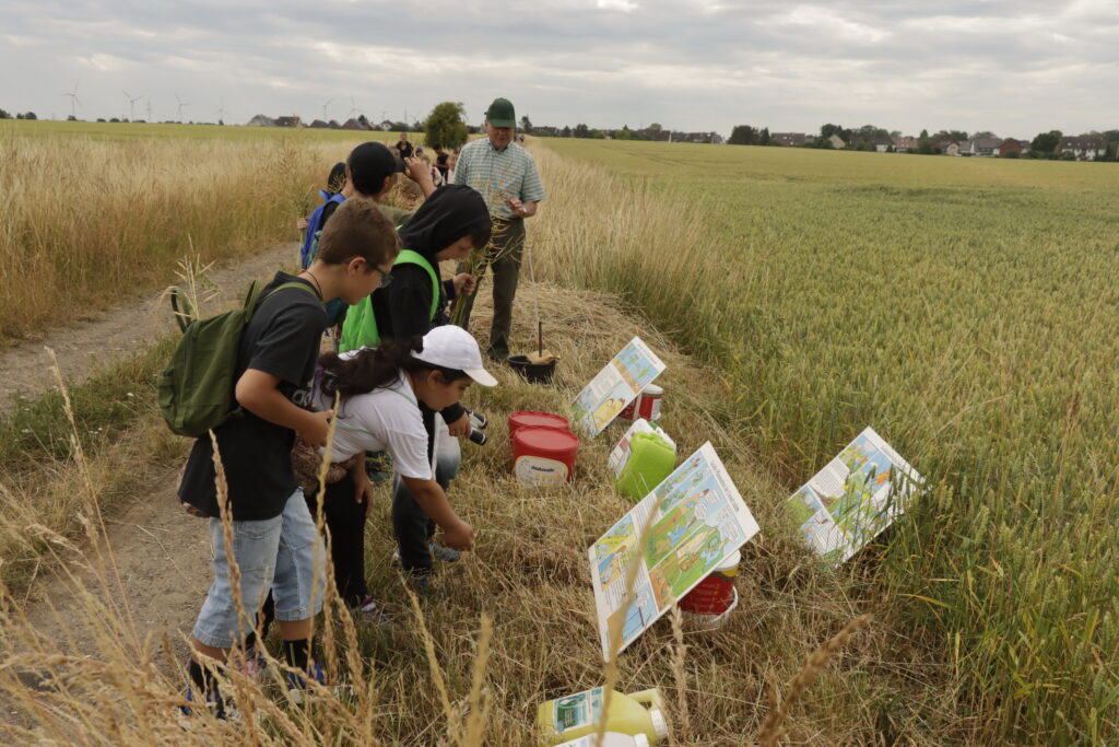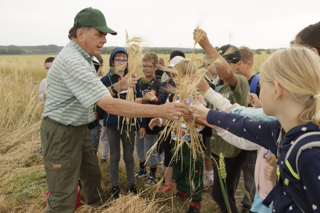 Um 9 Uhr holten Jürgen Bartels und Hans- Jürgen Thiemann die beiden Klassen von der Schule ab. Vier Stationen waren vom Agrarexperten Bartels in der Feldmark aufgebaut. Hier sollen die Drittklässler die unterschiedlichsten Landwirtschaftsprodukte kennenlernen. Am Winterweizen, hier wurden verschiedene Getreidearten präsentiert, im Eimer gedroschener Weizen und auf dem Tisch unser Täglich Brot. Die ausgeteilten Weizen, Roggen, Gerste, und Haferstängel wurden als Souvenir in den Rucksack gesteckt Auch den Speiseöllieferanten Raps konnten Wissbegierige aus den Schoten probieren. Der aus Mexiko stammende Mais dient nicht nur zur Ernährung, hauptsächlich zur Gewinnung von Methangas. Die Fragen der Schüler wurden beantwortet. Wissenswertes gab es auch über das Düngen der Felder.