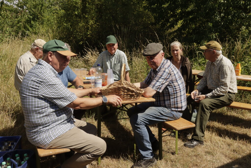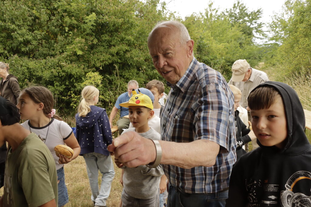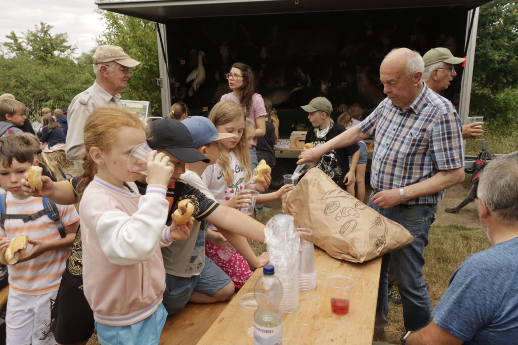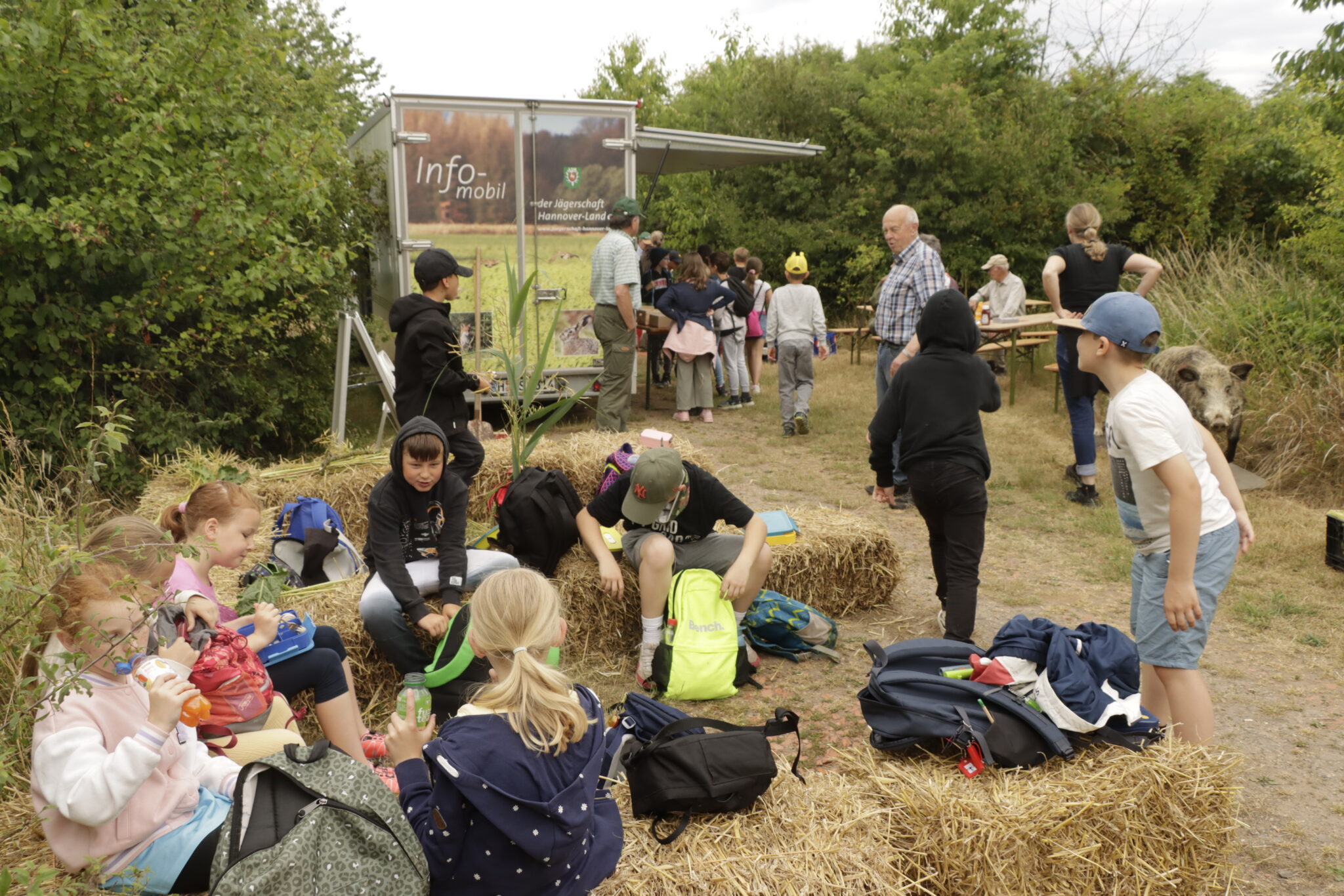 Wenn im Sommer die Sonne am höchsten steht, kurz bevor die Sommerferien beginnen, dann wandern die Jäger aus Öesselse und Ingeln mit 2 Klassen der örtlichen Grundschule durch die Feldflur.An den Müllinger Teichen wurden die letzten Vorbereitungen getroffen. Das vom Infomobil der Jägerschaft Hannover Land wurde geöffnet, platziert wurden Keiler und Wolf. das Infomaterial mit den Malbüchern wurde ausgepackt. Für Essen und Trinken hatte Eberhardt Ebeling gesorgt, für die Sitzgelegenheiten waren reichlich Strohballen angeliefert, das Wasser für die Bockwürstchen wurde erhitzt. Die 100 Brötchen wurden geschnitten.