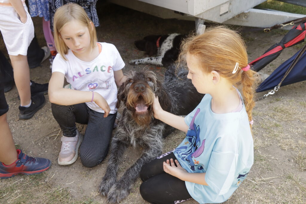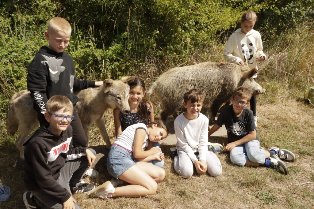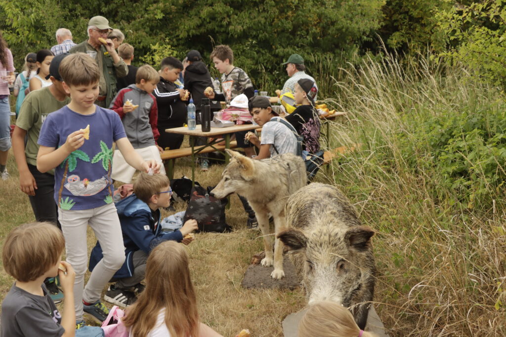 Beim Wandern entdeckten die Schüler an den ausgetrockneten Wegrändern vereinzelt Schmetterlinge, die in den blühenden Disteln Nahrung suchten. Am Ende der langen Wanderung stand das Infomobil der Jägerschaft. Doch zunächst wurden die mitgebrachten Frühstückbrote auf den Strohballen verzehrt. Danach bewunderten die Schüler die vielen ausgestellten Tiere im Infomobil, darunter auch ein Problemtier den Waschbären. Vogelnester und Kröten sind vor ihm nicht sicher. Auch die vier mitgebrachten Jagdhunde bekamen reichlich Streicheleinheiten. Die ausgelegten Malbücher und Prospekte wurden reichlich mitgenommen, Getränke und Bock-würstchen im frischen Brötchen waren sehr gefragt. Danach noch schnell ein Foto mit Wolf und Keiler bevor die Schüler den Rückweg antraten. Nach einem erfolgreichen Naturerlebnistag saßen die Hegeringmitglieder noch eine Weile zusammen, bevor der Abtransport begann.